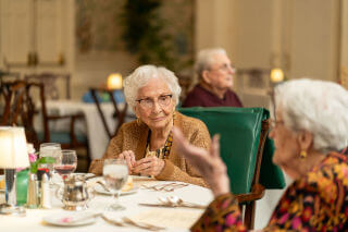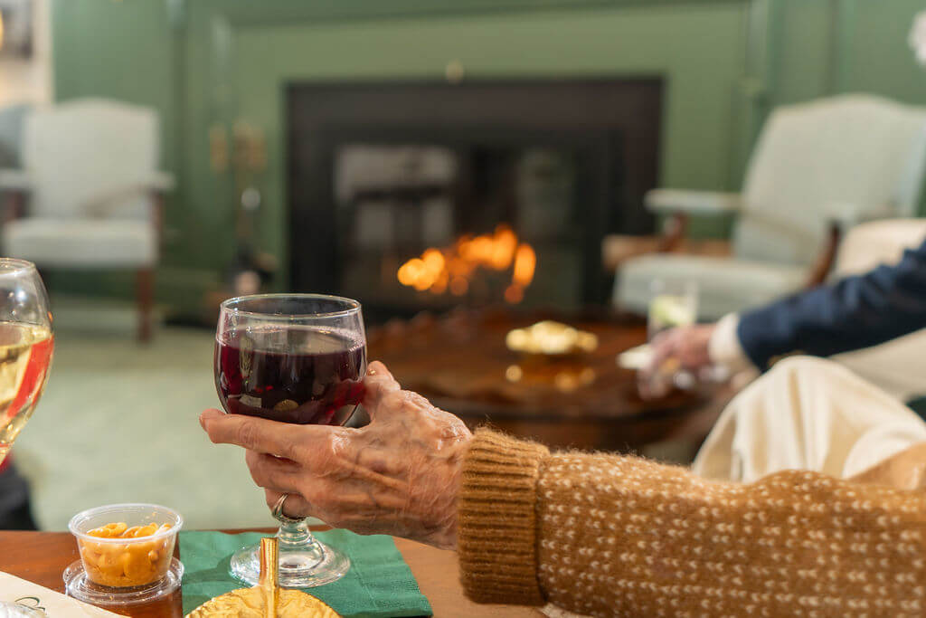 Our main dining room offers full table-side service with a rotating gourmet menu prepared fresh daily. Residents often gather here to share dinner, especially around the holidays, when seasonal meals and a warm fireplace set the tone.