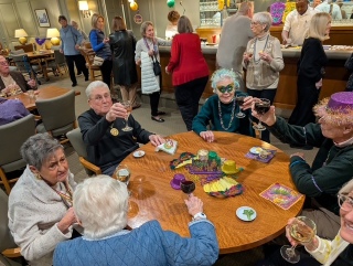 Each year, we celebrate Mardi Gras with a lively Dixieland band from Philadelphia performing upbeat New Orleans–style music as they stroll through the pub, living room, and conservatory. Residents enjoy festive small plates—including beignets—alongside signature drinks and bold décor in traditional purple, green, and gold. It’s an evening of music, flavor, and spirited celebration with friends.